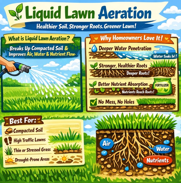 Beyond Aeration is a non-invasive liquid solution that breaks down compacted soil at a microscopic level. It promotes healthier soil and grass growth without leaving behind messy plugs. Unlike traditional machine aeration it covers 100% of the soil surfaces.