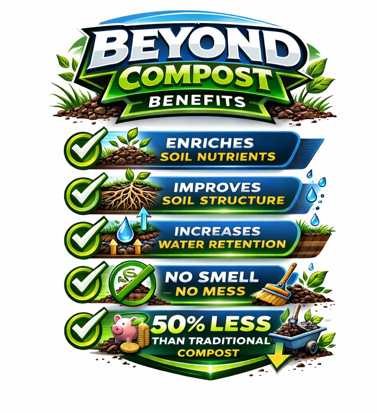 Beyond Compost Granular, no smell, no mess, holds moisture better than traditional compost. It also contains moisture boost to help year-round moisture retention in the soil. The best part it is 50% less than traditional compost.